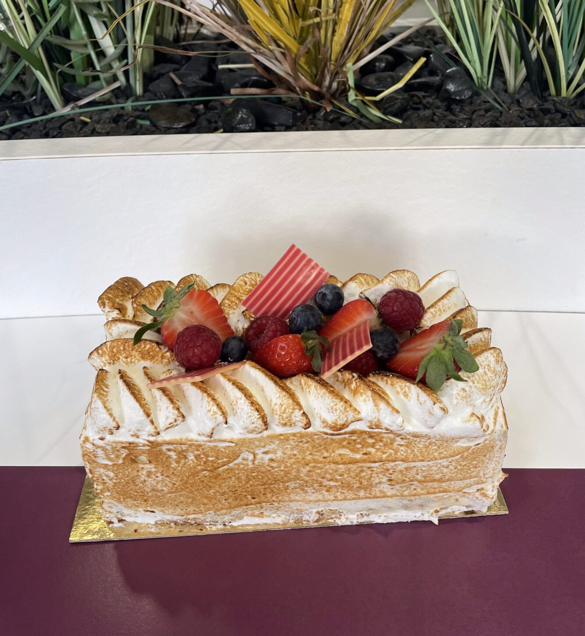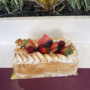 Fraises, framboises et myrtilles fraîches, crème mousseline vanille, biscuit noisette, meringue italienne